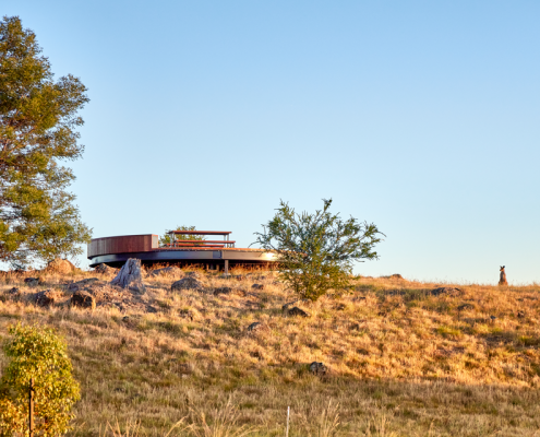 A sleek floating boardwalk and lookout on a rocky knoll at developer…
